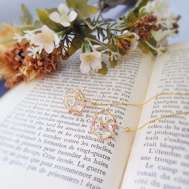 立体キューブの中に大粒のダイヤモンドカットクリスタルが輝くアメリカンフックピアス/イヤリングです